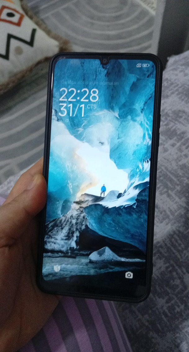 Koyu mavi renkte Android telefon, canlı ekranı ile saati ve tarihi gösteriyor.