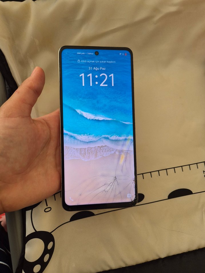Büyük ekranlı koyu mavi Android telefon, ekranın alt kısmında çatlak bulunuyor 1 sene kullanıldı Baska problemi yok