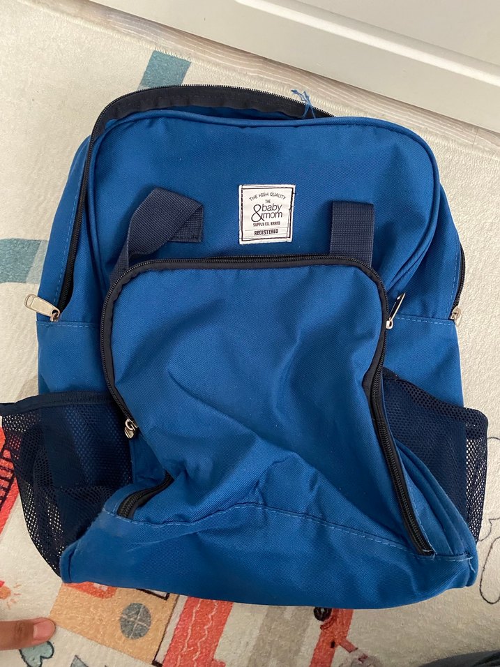 Koyu mavi anne bebek çantası, çoklu fermuarlı bölmeler ve yan file cepler içerir. Dayanıklı ve kullanışlı bir tasarıma sahiptir. Temizdir . #annebebek #çanta