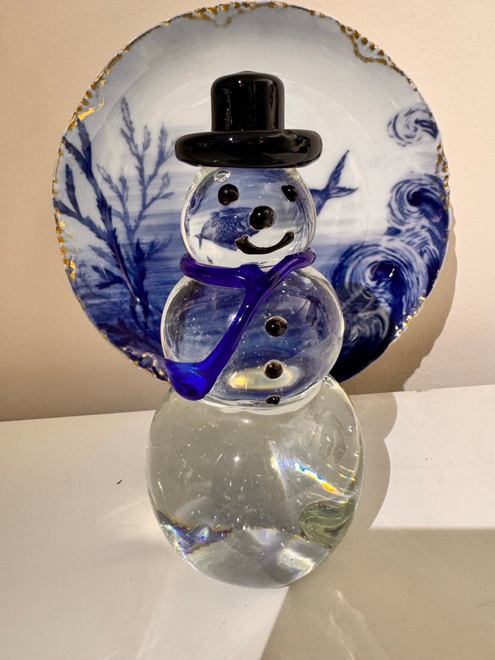 Koyu mavi atkı ve siyah şapka detaylı, şeffaf camdan yapılmış kardan adam biblo. Gülümseyen yüz ve düğme detayları bulunur. ❄️