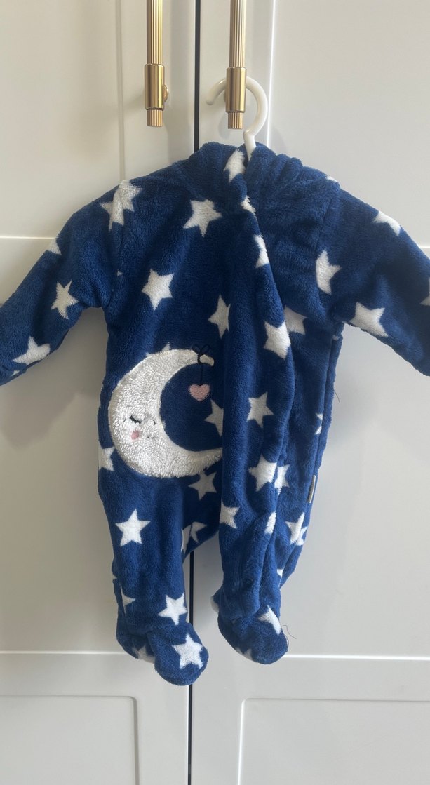 Koyu mavi renkte, yıldız desenli ve ay figürlü, kürk detaylı, yumuşak kumaştan bebek tulumu. Kalın kumaş sadece 1 kere giyildi bebeğim kilolu doğduğu için olmadı marka temsilidir