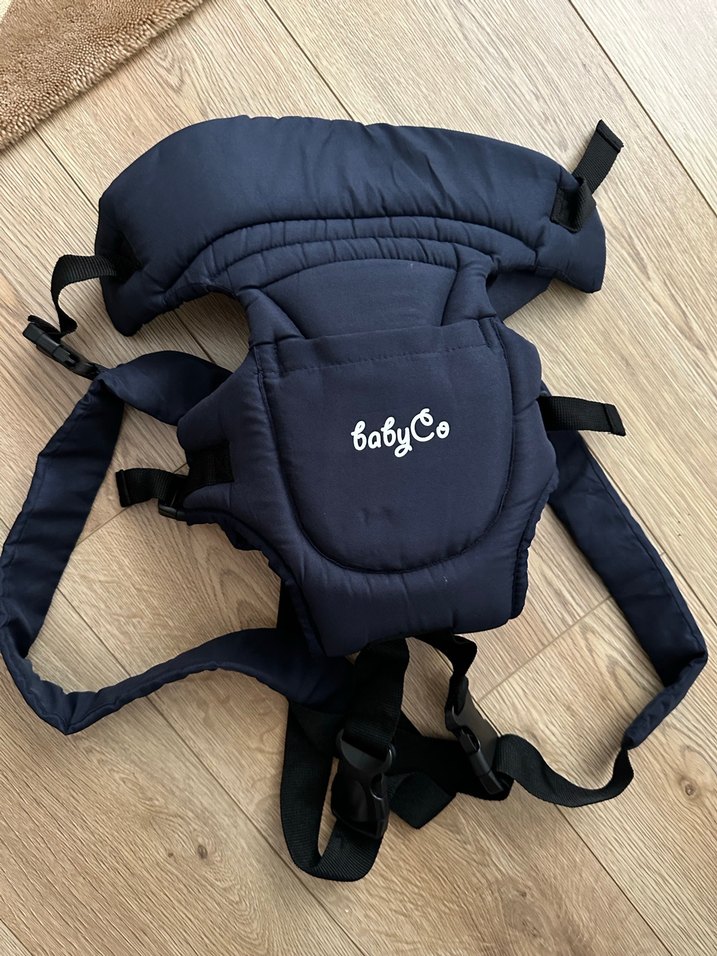 Koyu mavi BabyCo bebek taşıyıcı, yumuşak kumaş ve güvenli tokalarla rahat taşıma sağlar. Hiç kullanmadık