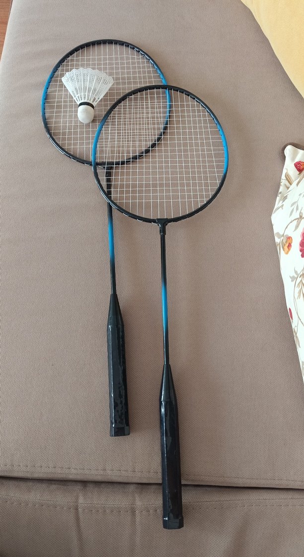İki koyu mavi badminton raketi ve bir tüy topu içeren oyun seti. son resimde çektim görüldüğü gibi taşıma kılıfında yırtık var dikilebilinir kullanıma zararı yoktur