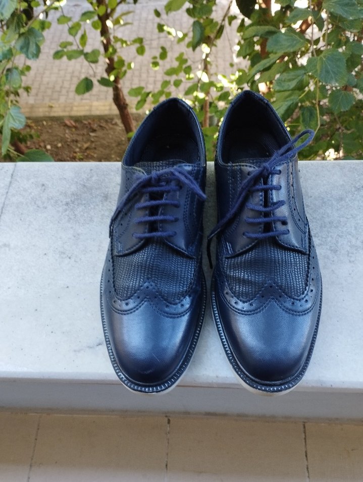 Koyu mavi renkte, bağcıklı erkek klasik ayakkabı. Düz, desensiz tasarım ve kauçuk tabanlı, geleneksel tarzda günlük kullanıma uygun.
