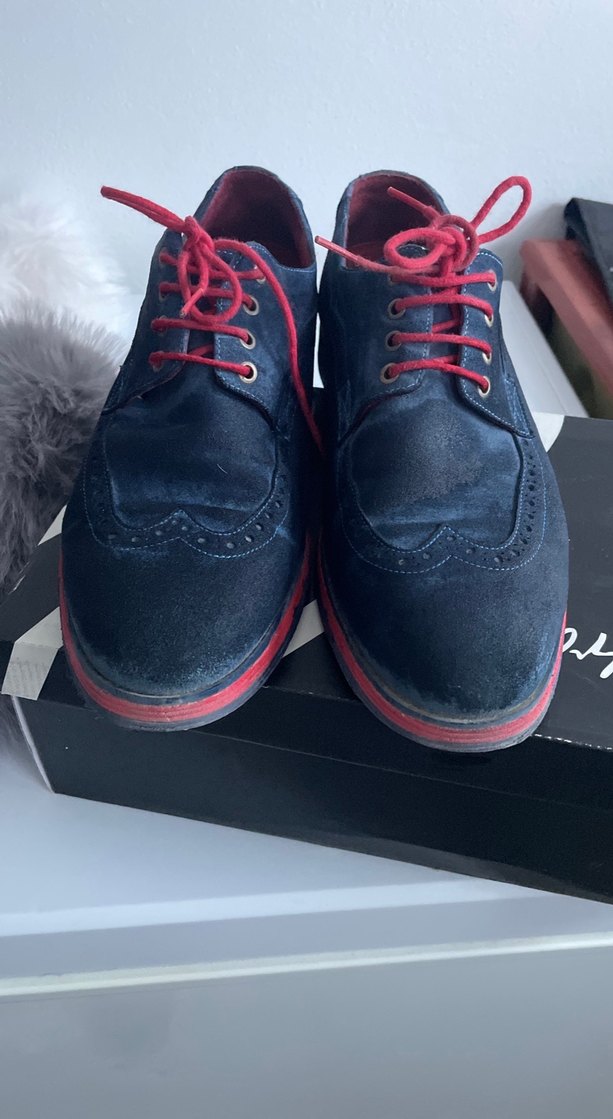 Koyu mavi renkte, kırmızı bağcıklı ve kauçuk tabanlı erkek klasik ayakkabı. Günlük sokak modasına uygun, desensiz yüzeye sahip. İnci marka44 nr