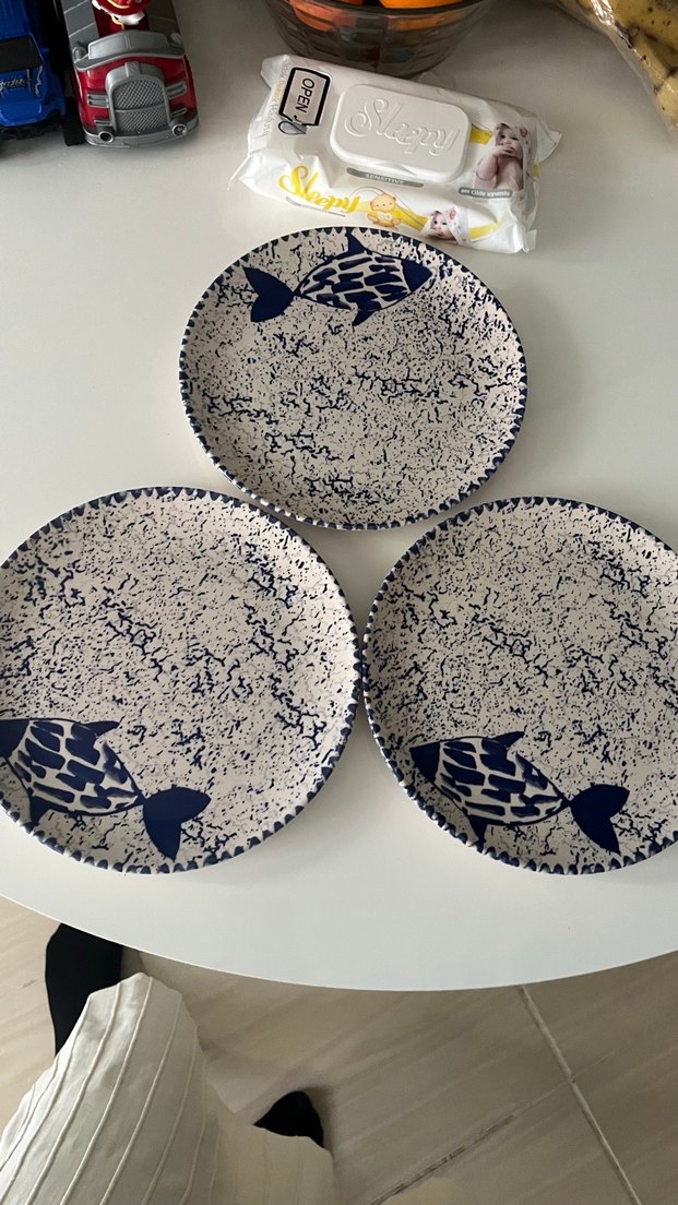 Koyu mavi balık desenli, benekli desene sahip yemek tabakları seti. Yemek servisi için uygundur.