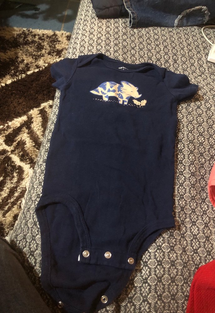 Koyu mavi renkte, kısa kollu ve boğazlı bebek body. Üzerinde dinozor baskısı bulunur ve kolay giydirme için çıtçıtlı kapama vardır.