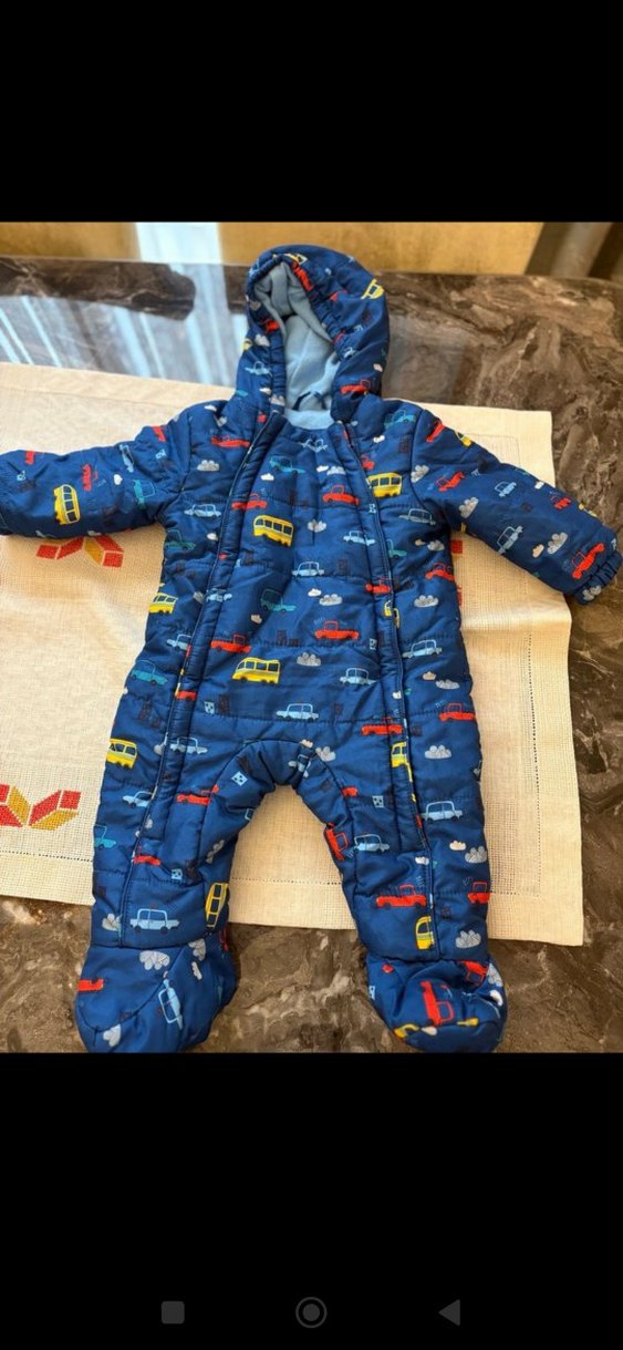 Koyu mavi baskılı bebek tulumu, içi yumuşak ve sıcak tutan kürk detaylıdır.