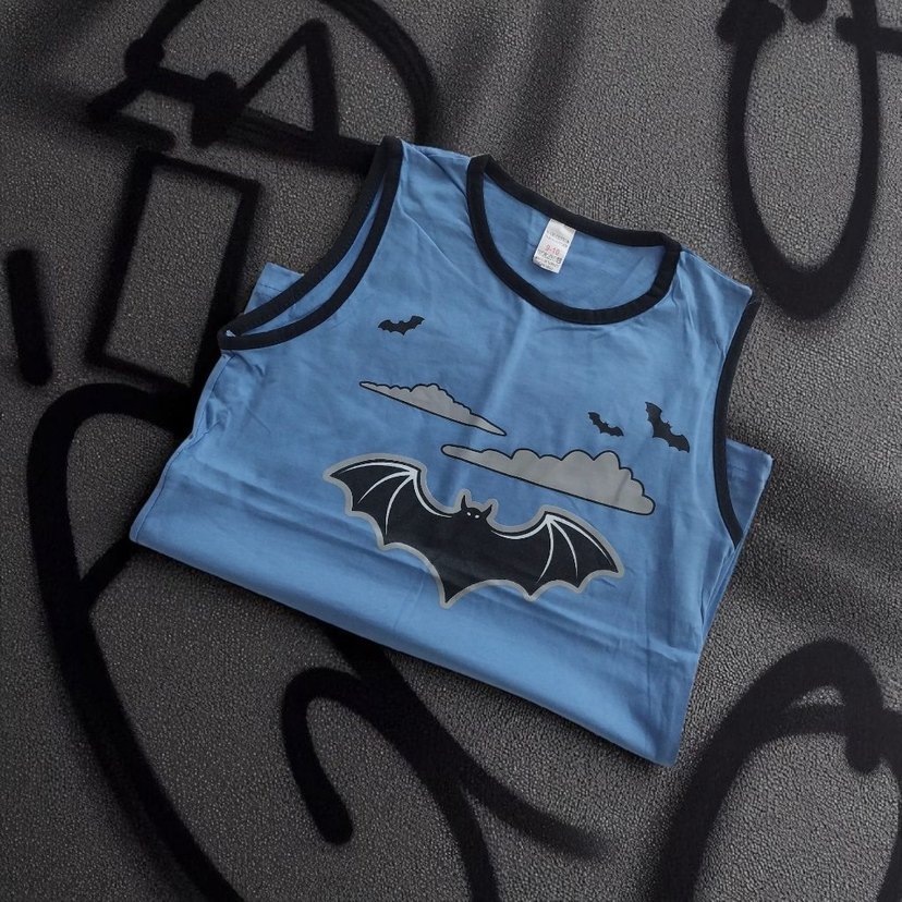 Koyu mavi renkli çocuk atlet, üzerinde yarasa ve bulut baskısı bulunur. Yaka ve kol kenarları siyah renktedir.