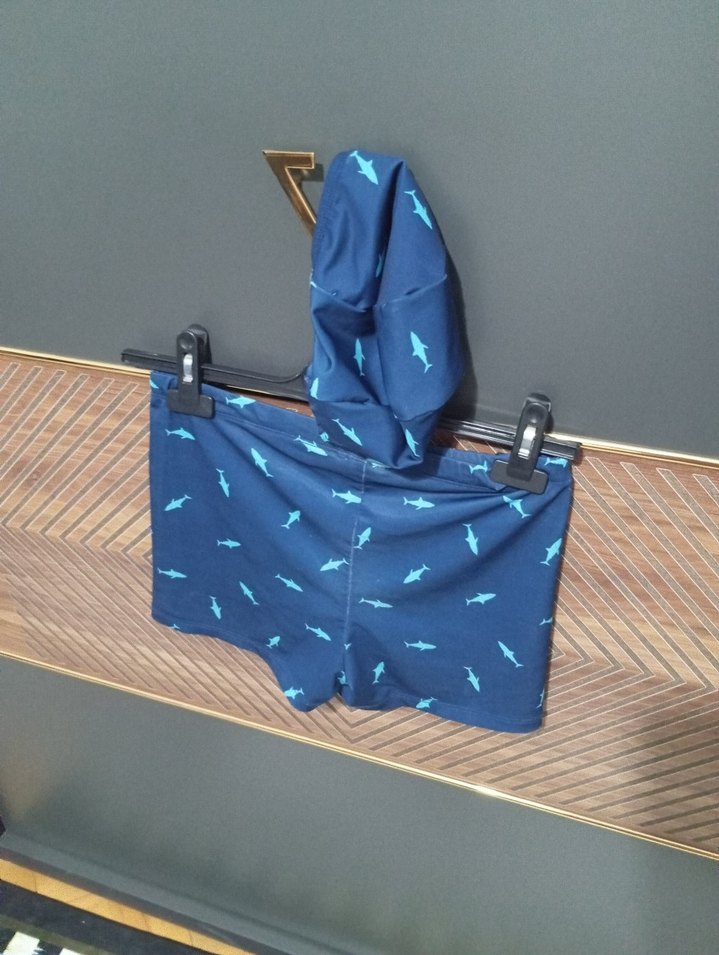 Koyu mavi renkli, baskılı köpekbalığı desenli ve askılı erkek çocuk mayo takımı. çok az giyildi. beden 12- 13 yaş