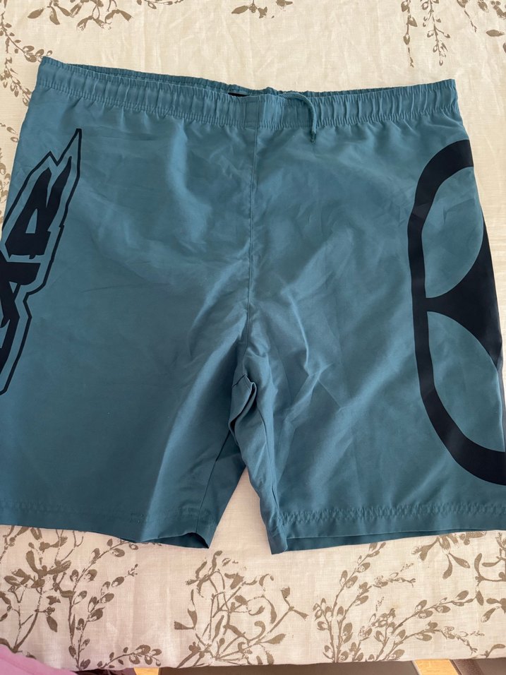 Koyu mavi renkli, baskılı ve kemerli, fit kesim erkek mini şort. Plajda sokak stili için uygundur.