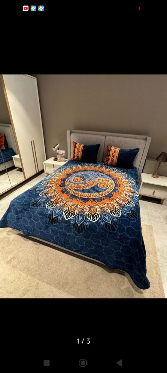 Koyu mavi batik desenli yatak örtüsü, detaylı turuncu ve mavi motiflerle dikkat çekiyor. Yatak odasına renkli ve özel bir hava katıyor. ️çift kişilik iki üç kez kulanildi sıfırdır tertemiz