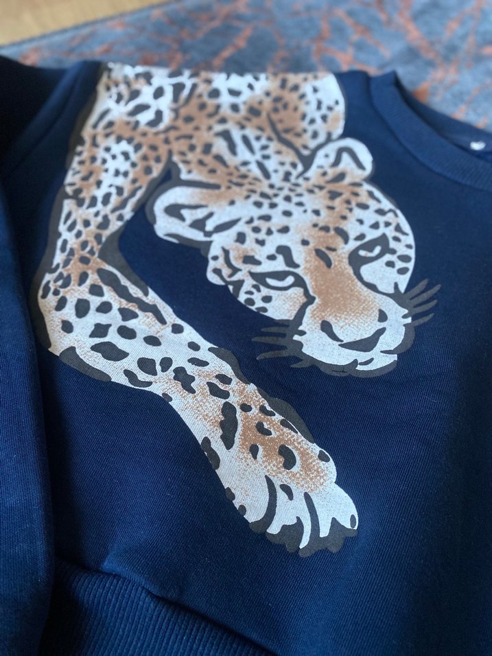 Koyu mavi renkli, bol kesim erkek çocuk sweatshirtü, yuvarlak yaka ve uzun kolludur. Sentetik kumaş üzerinde kürk detaylı baskılı leopar deseni vardır.