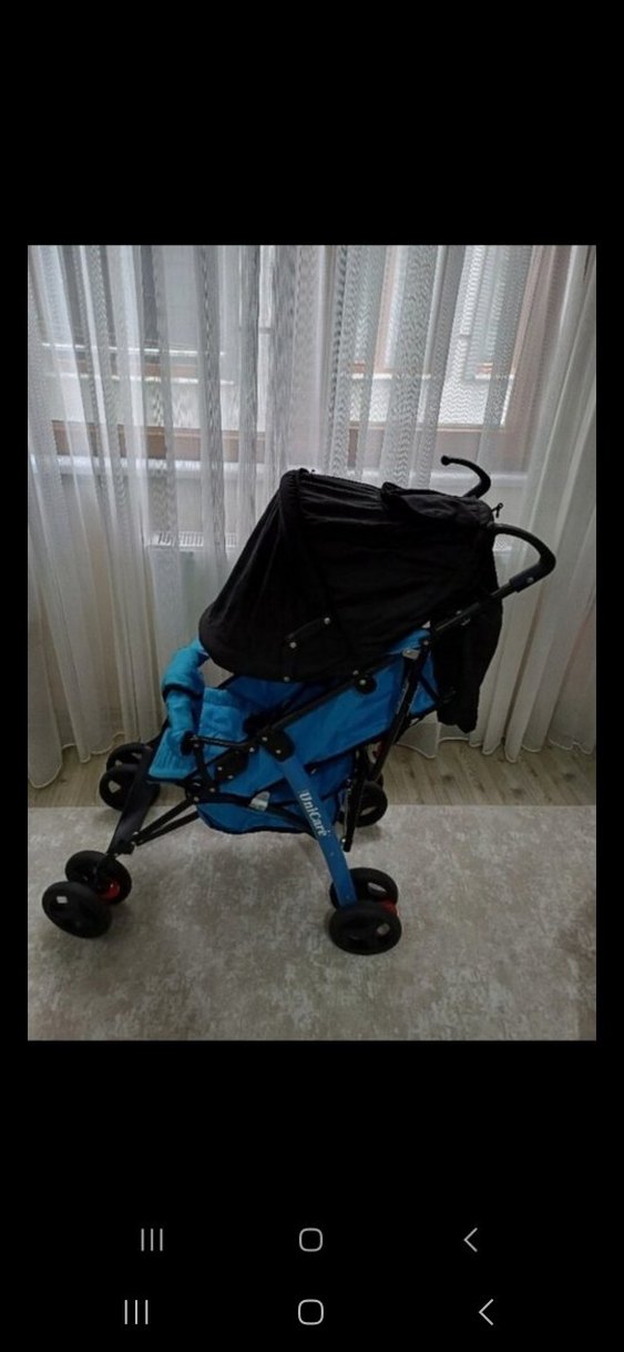 Koyu mavi renkli, katlanabilir yapıya sahip bebek arabası, siyah tente ve kolay hareket için çiftli tekerleklerle donatılmıştır.