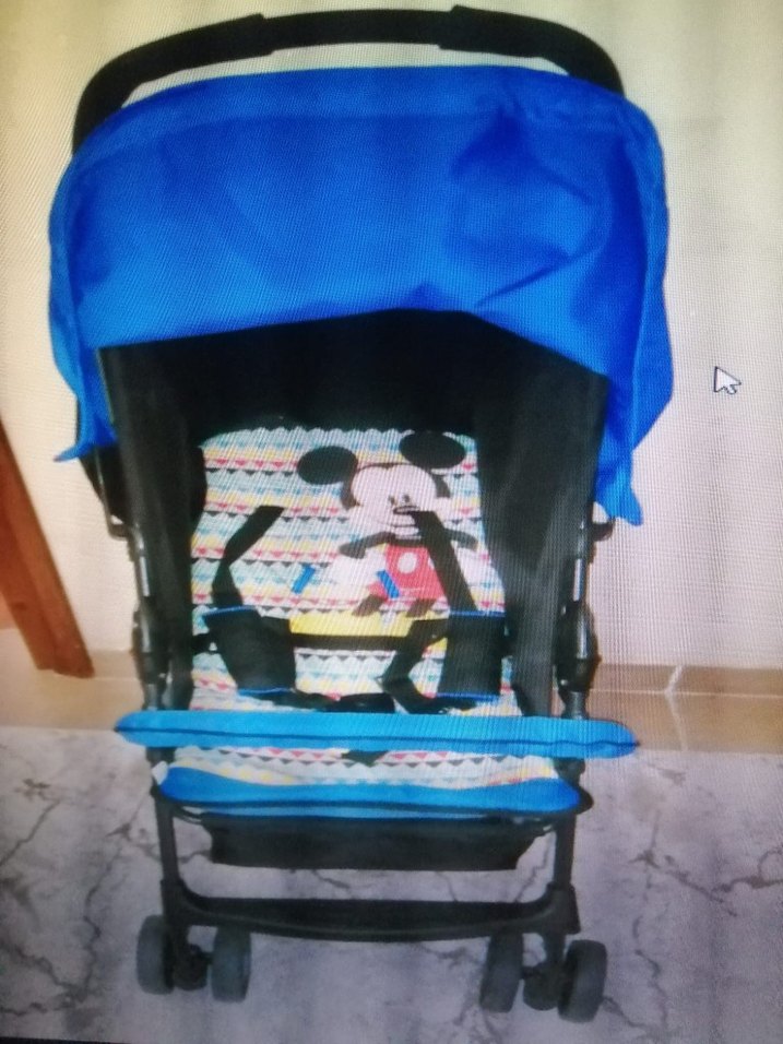 Koyu mavi bebek arabası, Mickey Mouse desenli oturma alanı, koruyucu tente ve güvenli emniyet kemerlerine sahiptir.