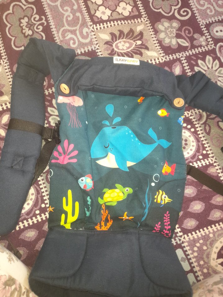 Koyu mavi bebek kangurusu, balina, kaplumbağa ve balık desenleriyle renkli ve eğlenceli. Rahat dolgulu askıları bulunur.