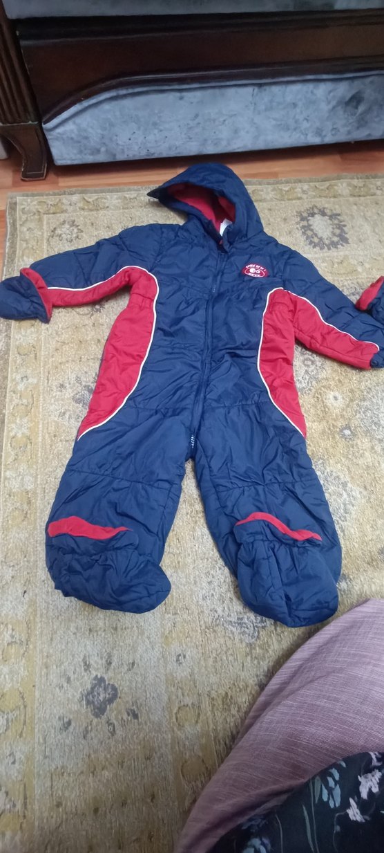 Koyu mavi, kapüşonlu bebek kayak tulumu, fermuarlı ön kısmı ve kırmızı detaylarıyla sokak tarzına uygun, yumuşak ve sıcak kumaştan yapılmıştır. ❄️