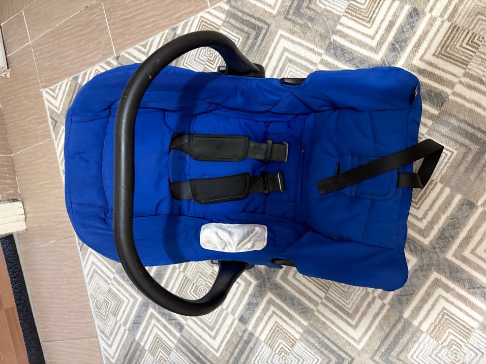 Koyu mavi renkli, yumuşak kumaşlı ve ayarlanabilir güvenlik kemerlerine sahip bebek oto koltuğu.