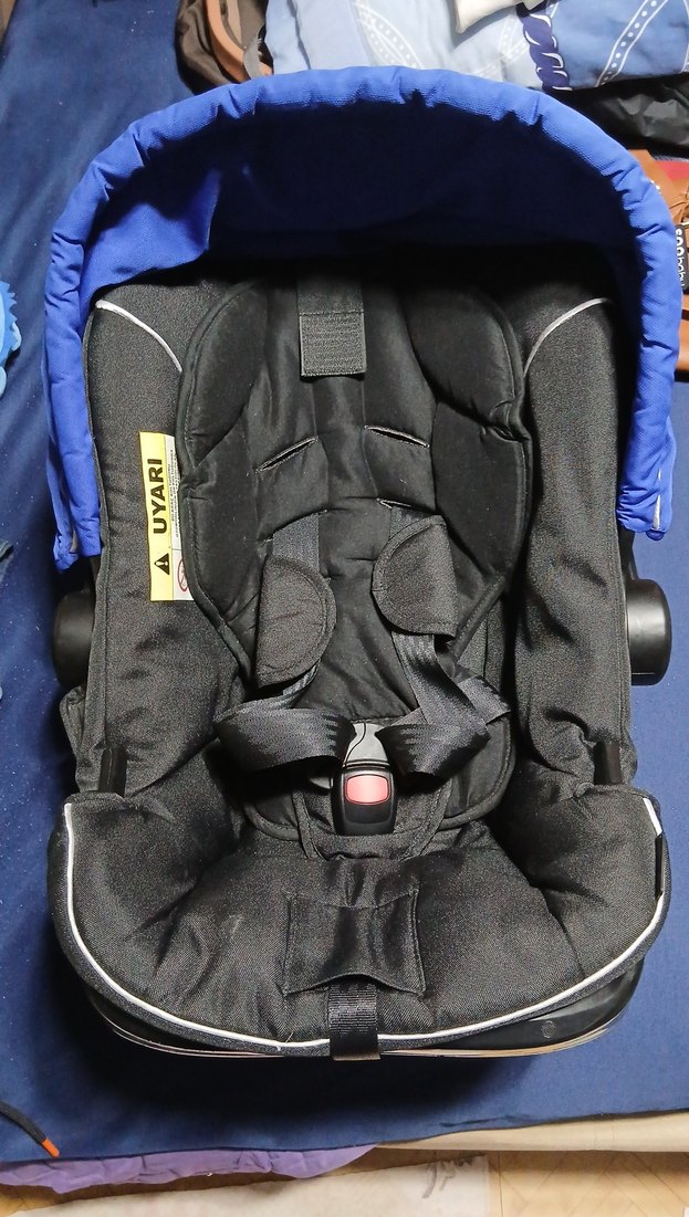 Koyu mavi bebek oto koltuğu, yastıklı siyah iç kısım ve güvenli emniyet kemeri sistemi ile konforlu ve güvenli kullanım sağlar.