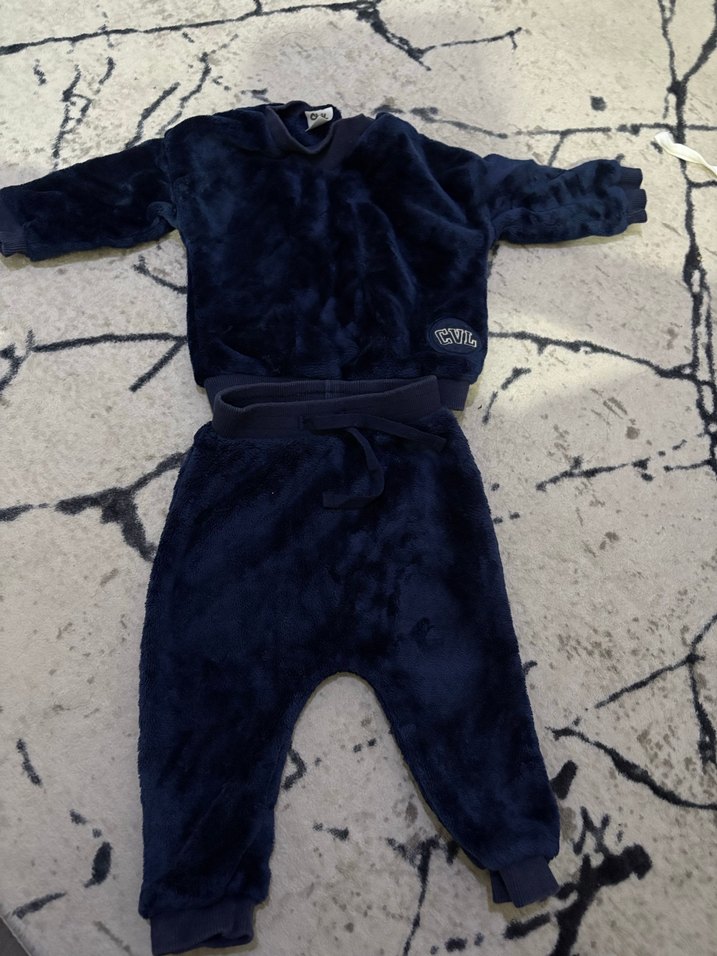 9-12 ay Koyu mavi renkli, uzun kollu, yuvarlak yaka bebeğe uygun peluş kumaştan yapılmış, kürk detaylı sıcak tutan takım.