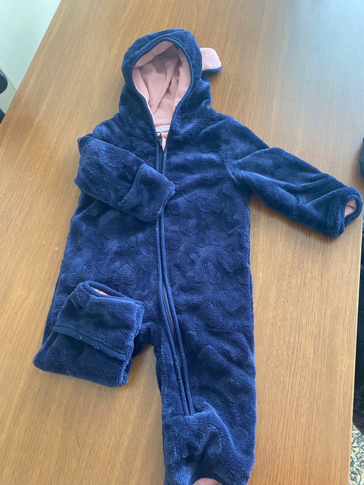 Koyu mavi renkte, yumuşak ve sıcak peluş kumaştan yapılmış, kapüşonlu ve kürk detaylı bebek tulumu. Düz ve fermuarlı ön tasarıma sahiptir.
