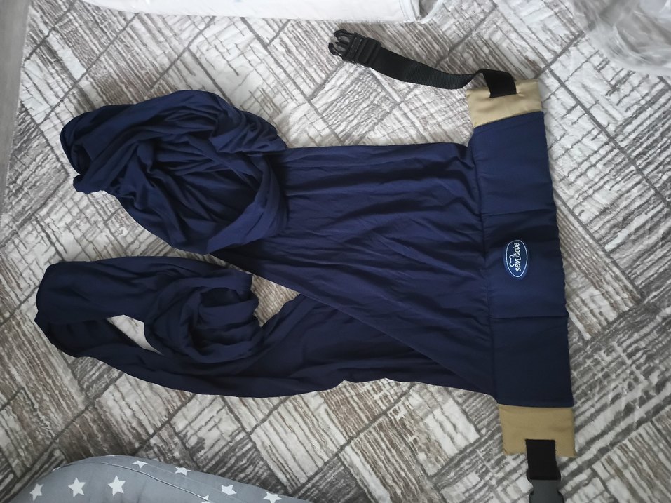 Yumuşak kumaştan yapılmış, ayarlanabilir askılı koyu mavi bebek taşıma askısı.