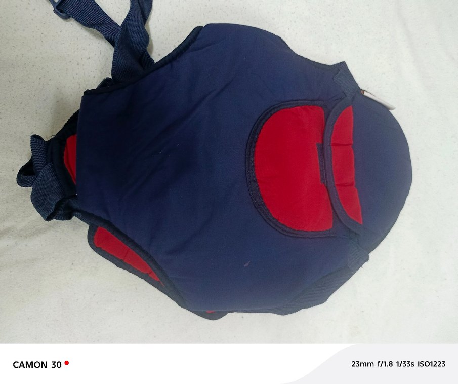 Koyu mavi renkli, kırmızı destek pedlerine sahip ayarlanabilir kayışlı bebek taşıyıcı. Rahat ve güvenli taşıma sağlar.