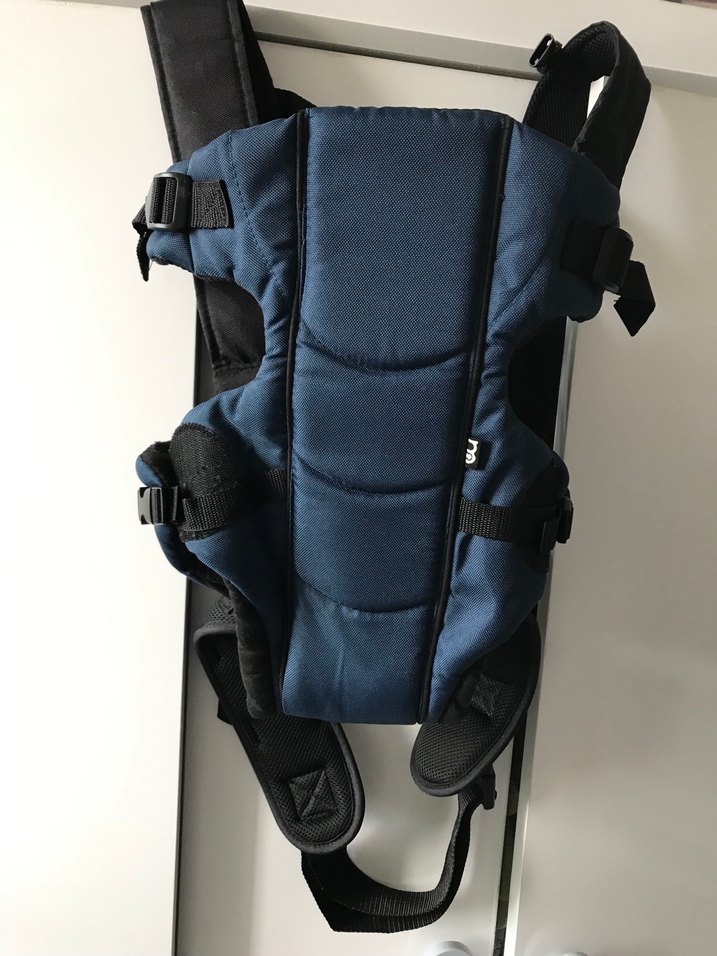 Ayarlanabilir kayışları ve yumuşak destekleri olan koyu mavi bebek taşıyıcı. Bebekleri güvenle taşımaya uygundur.