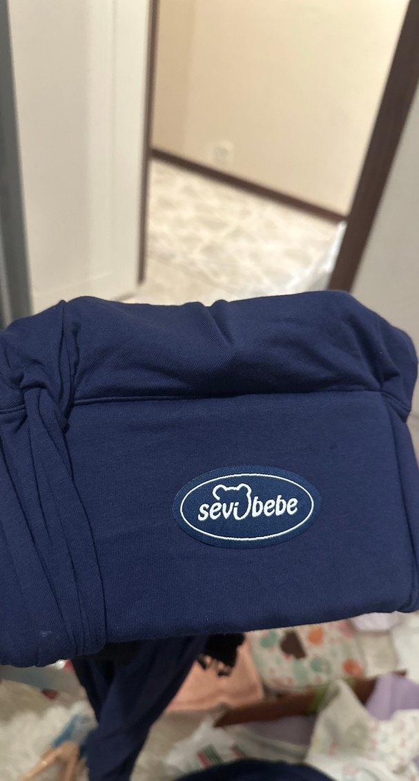 Sevibebe markasına ait koyu mavi bebek taşıyıcı, yumuşak ve rahat kumaştan yapılmıştır.