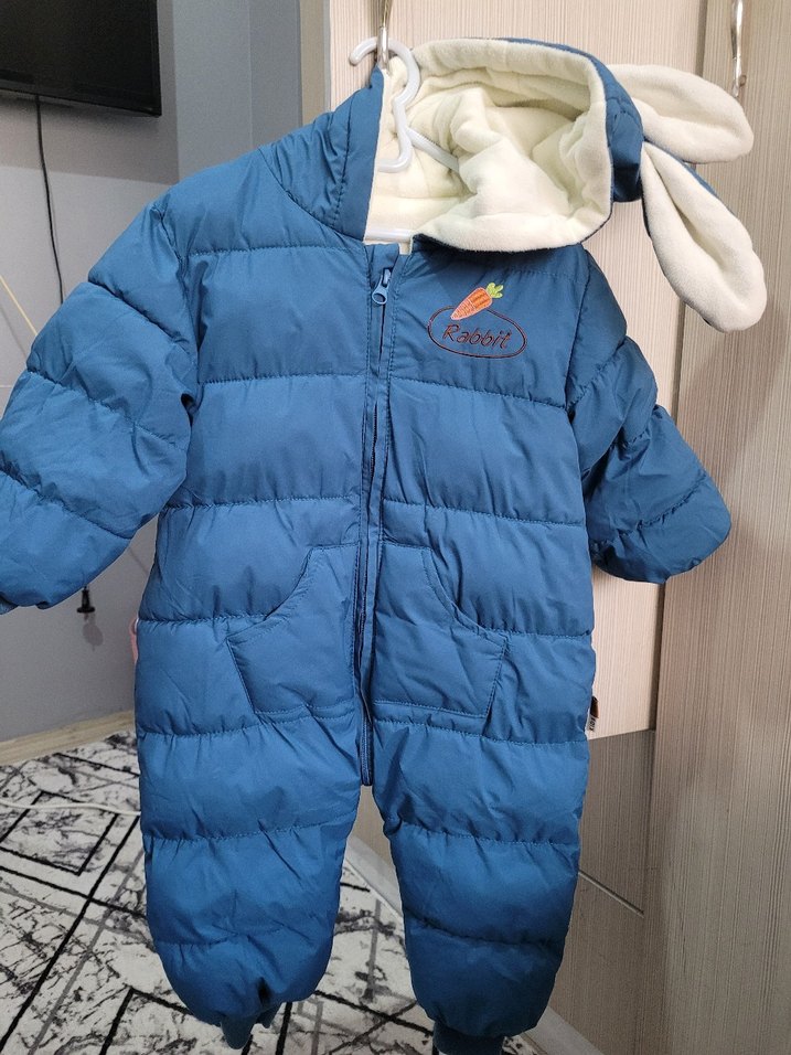 Koyu mavi renkli, fermuarlı bebek tulumu yumuşak astarlı ve kapüşonunda tavşan kulaklarıyla eğlenceli baskıya sahip.