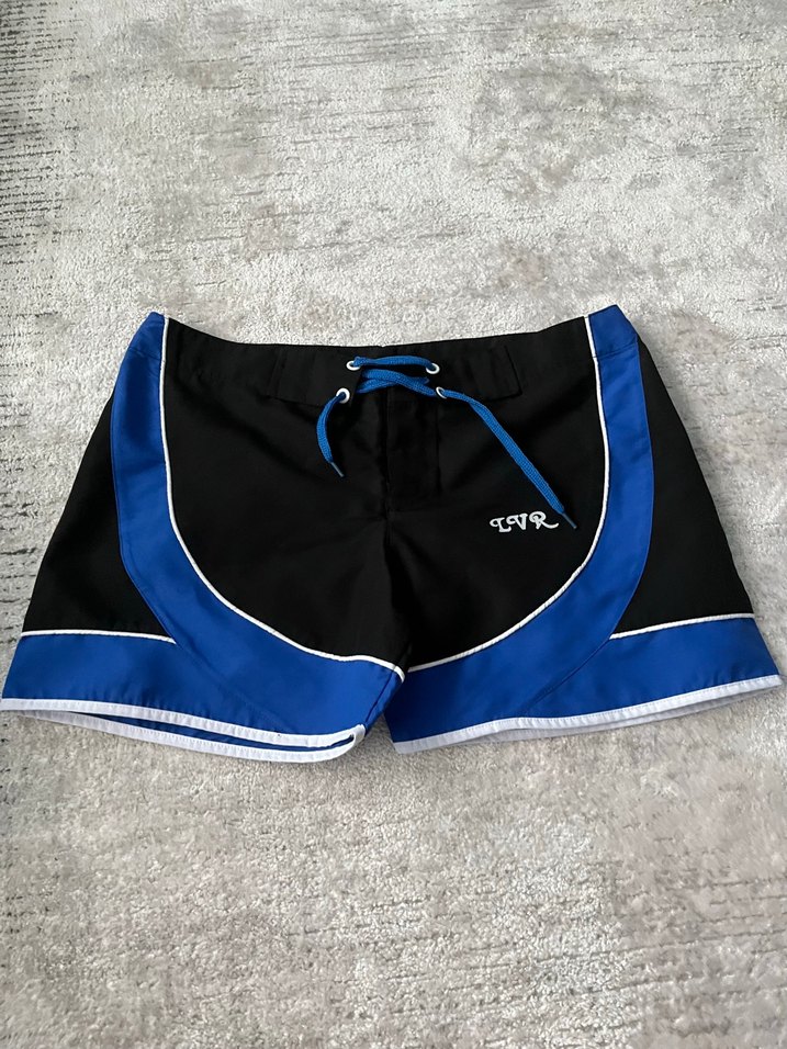 Koyu mavi renkli, pamuklu kumaştan üretilmiş, beli kemerli ve dar kesimli kadın mini deniz şortu