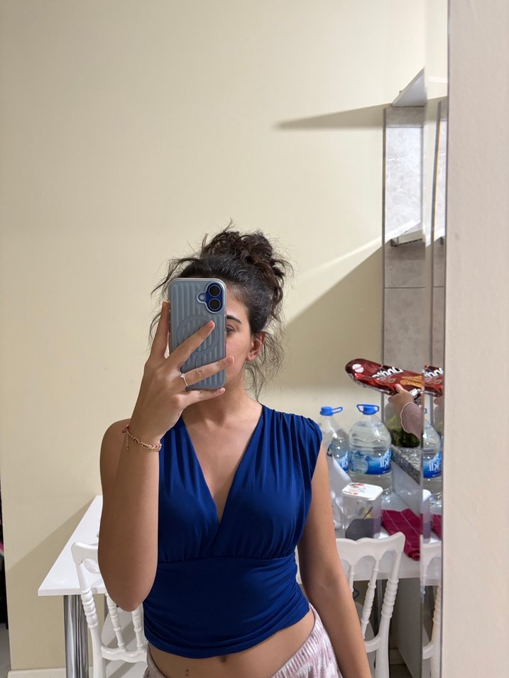 Günlük kullanım için mavi renkte, şık ve sade bluz.S bedene uyumludur. Dolapta fazlalık olduğu için satıyorum. X bir butikten almıstım hatırlamıyorum. Sadece 1 kere giydim