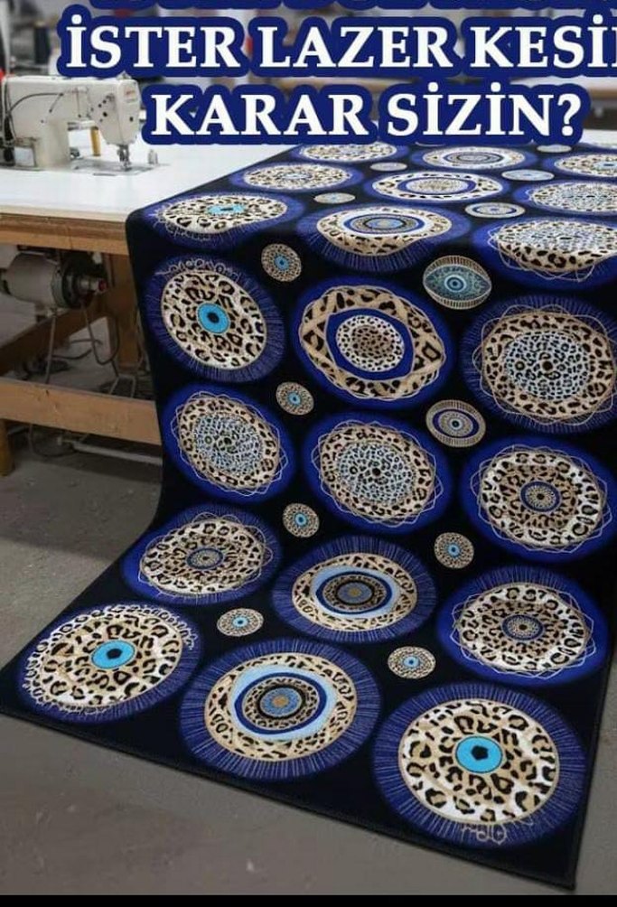 Koyu mavi renkli, bohem tarzda baskılı halı. Dairesel desenler ve leopar desenli detaylar içerir. Üzerinde "ISTERLAZERKESI, KARARSIZIN?" yazısı bulunur.
