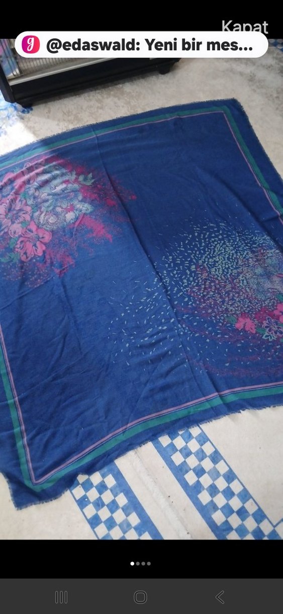 Koyu mavi renkte, çiçek desenli, bohem tarzda kadın şalı. Hafifçe drapelenmiş tekstil malzemeden yapılmıştır.