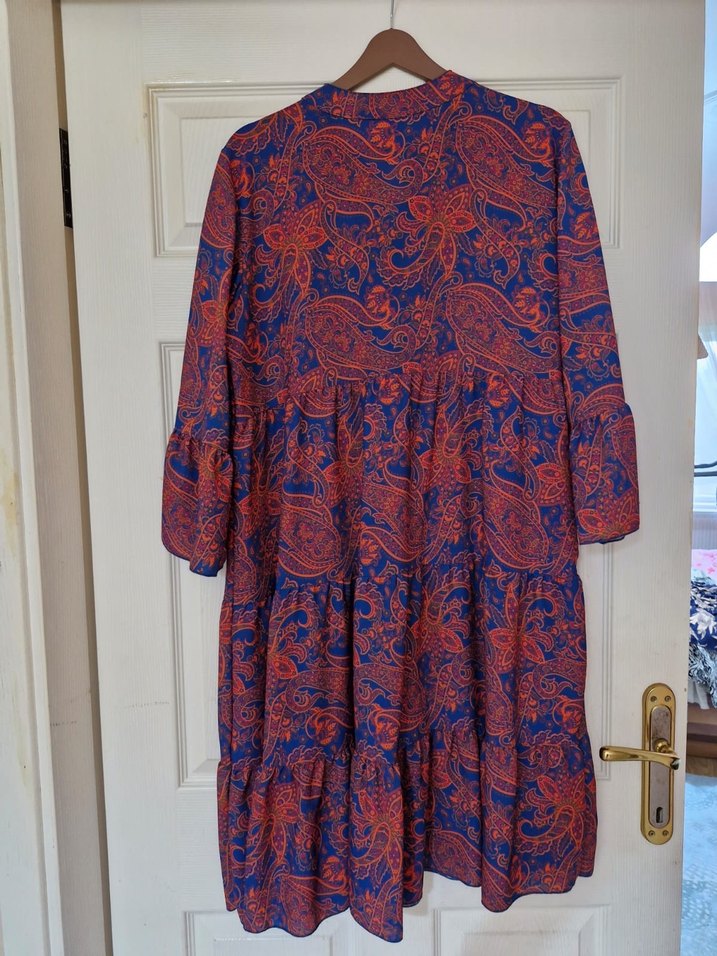 Koyu mavi ve canlı desenli, yüksek yakalı, uzun kollu, bol kesim uzun elbise. Fırfır detaylarıyla bohem tarzı yansıtıyor. 42 44 beden