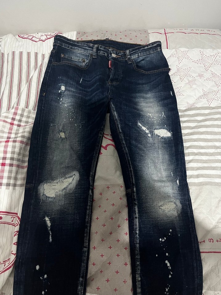 Koyu mavi renkte, bol kesim ve kemerli detaylı kot pantolon. Yıpranmış ve boya sıçratma efektli, günlük sokak stili için uygun.