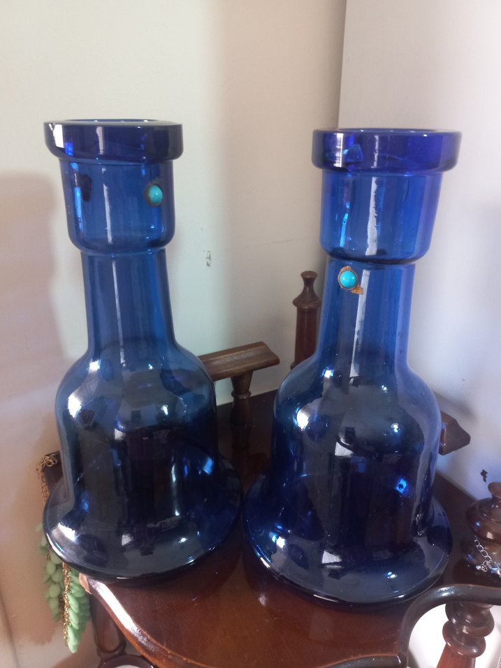 Koyu mavi camdan yapılmış, geniş tabanlı ve dar boyunlu iki vazo seti. Her biri küçük turkuaz süslemeye sahip.