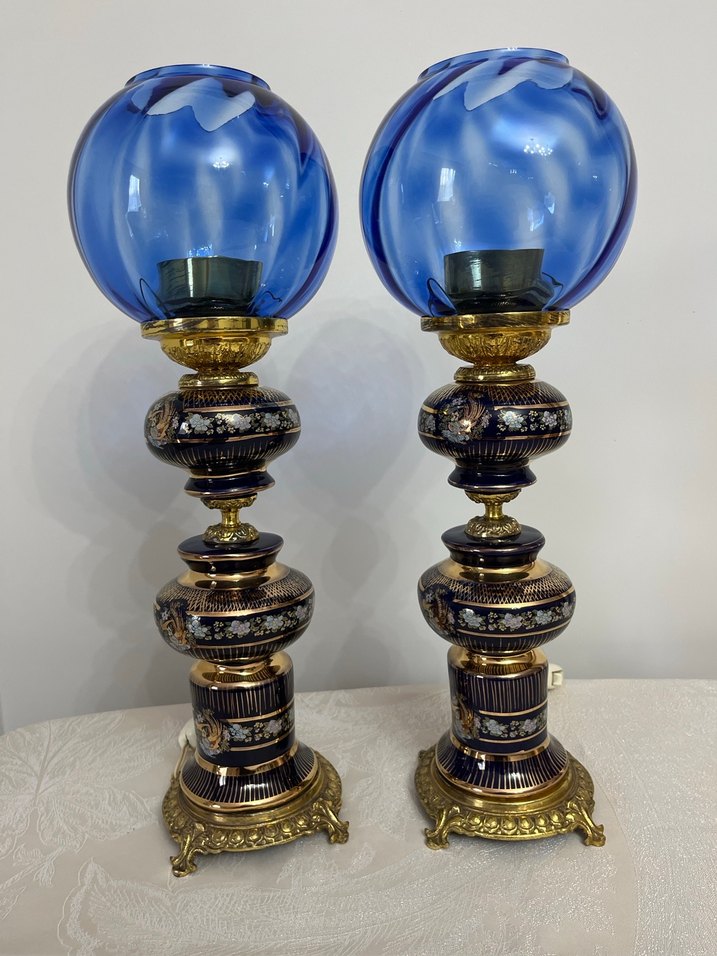 Koyu mavi cam küreli ve altın detaylı antika masa lambası çifti. Dekoratif ve şık aydınlatma ürünleri.