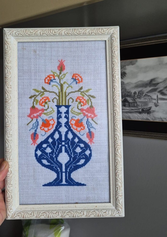 Çerçeveli kanaviçe tablo, koyu mavi vazoda renkli çiçekler ve detaylı işleme ile süslenmiştir. 30/19 cm.. ince etual etamine işlenmiştir..