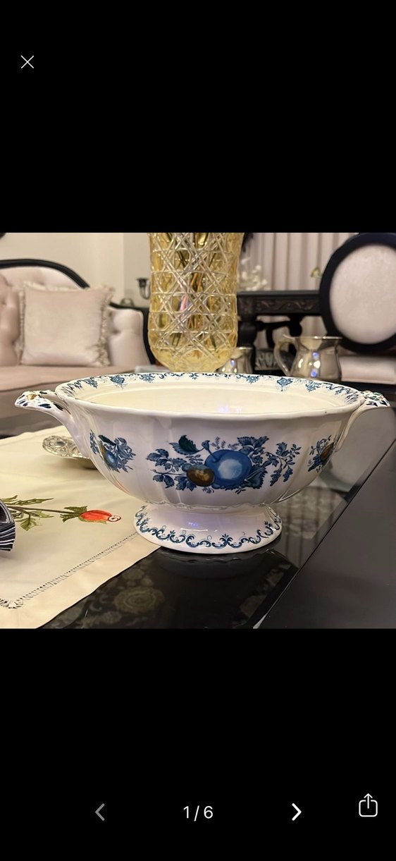 Koyu mavi çiçek desenli, kulplu klasik beyaz seramik servis kasesi. Ayaklı tasarımıyla sağlam durur. ️