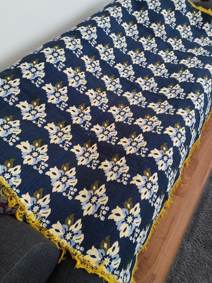 Nostalji Koyu mavi zemin üzerinde çiçek desenli, sarı püsküllü kenarlarıyla çift taraflı pike