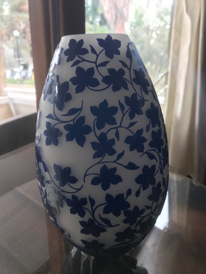 Beyaz zemin üzerine koyu mavi çiçek desenleriyle süslenmiş vazo.