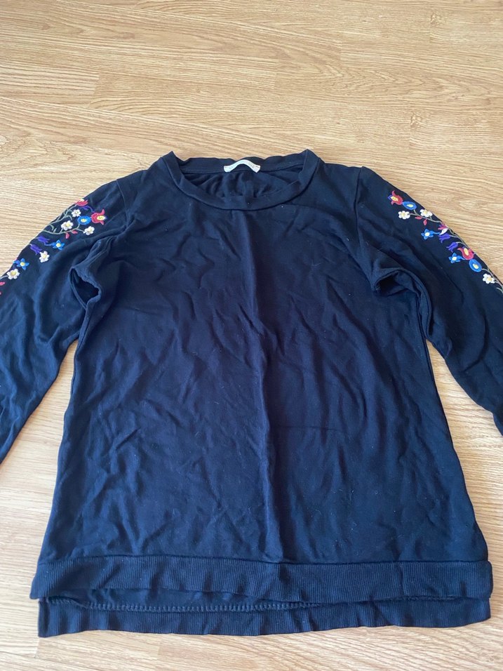 Koyu mavi, uzun kollu, yuvarlak yakalı, bol kesim kız tişörtü. Kollarında çiçek işlemeleri ve düğme detaylarıyla sokak modasına uygun.