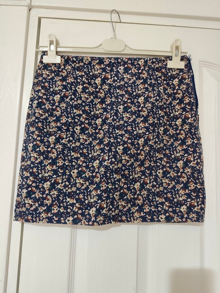 Koyu mavi çiçek desenli, kısa ve dar kesim mini etek. Koton markadır. Daha çok sonbahar ve kış için uygundur. Temiz kullanıldı.