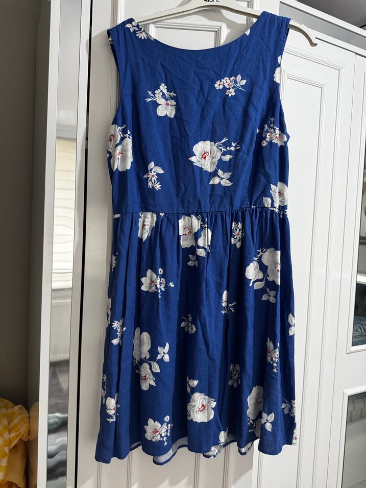Koyu mavi renkte, straplez yaka ve pileli detaylara sahip pamuklu midi elbise. Bol kesim ve vintage çiçek desenleriyle bohem tarzı yansıtıyor.