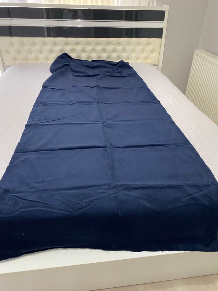 Koyu mavi renkte, desensiz ve çizgili bir tasarıma sahip kumaş boy:230cm genişlik:90 cm