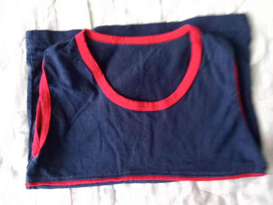 Yumuşak dokulu koyu mavi çocuk atlet, kırmızı yaka ve etek ucu detaylarına sahip.