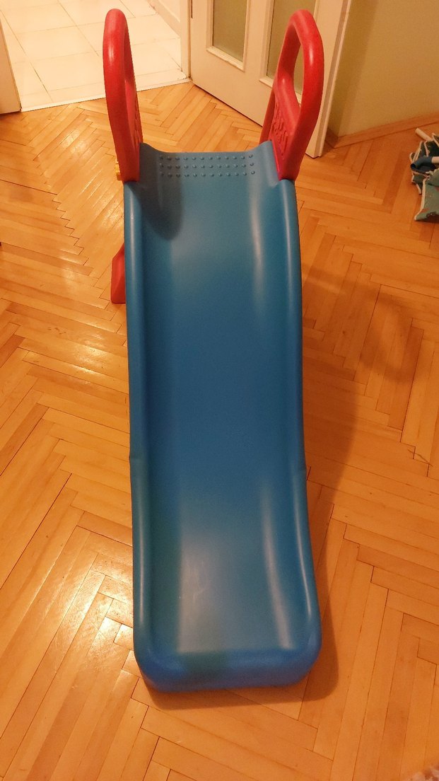 Koyu mavi renkte, kırmızı yan tutacaklı çocuk kaydırağıdır. İç mekan kullanımı için uygundur ve çocuklar için eğlenceli bir oyun alanı sunar.