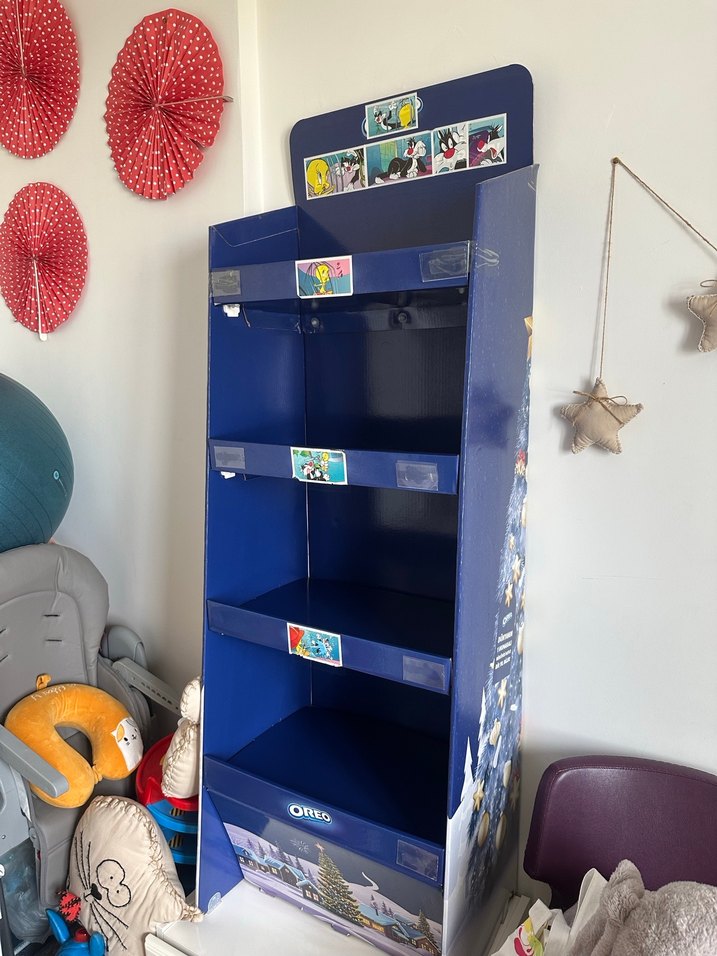 Koyu mavi renkte, çok bölmeli çocuk rafı, çizgi film karakterli dekorasyonla çocuk eşyalarını düzenlemek için uygun.