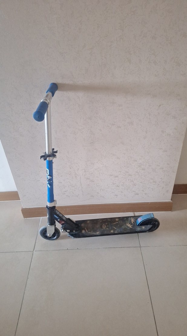 Koyu mavi renkte, rahat tutacaklı ve desenli tabanlı sağlam çocuk scooterı.